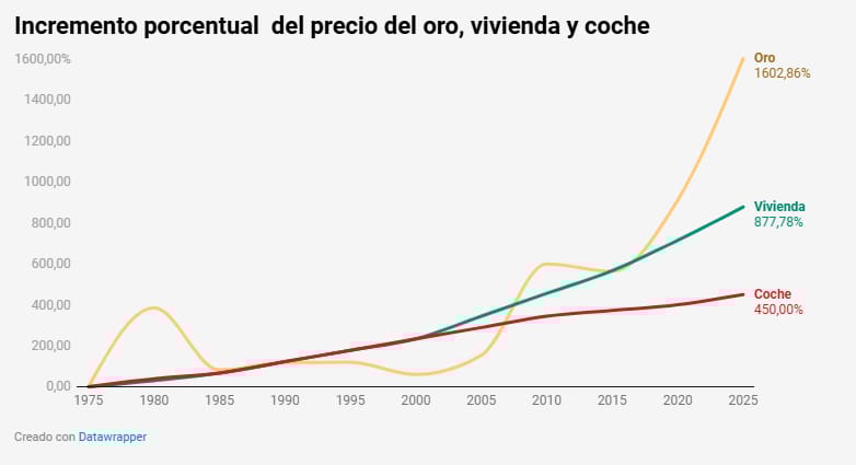 De hecho, si vemos el precio de la vivienda en oro, este no ha aumentado, ¡sino que ha disminuido! Algo raro entonces deben de tener los papelitos verdes que nos da desinteresadamente el gobierno.