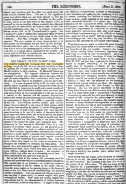 En El Economista de Junio 1869 dice: “Es muy probable que las leyes de patentes sean abolidas en breve...".